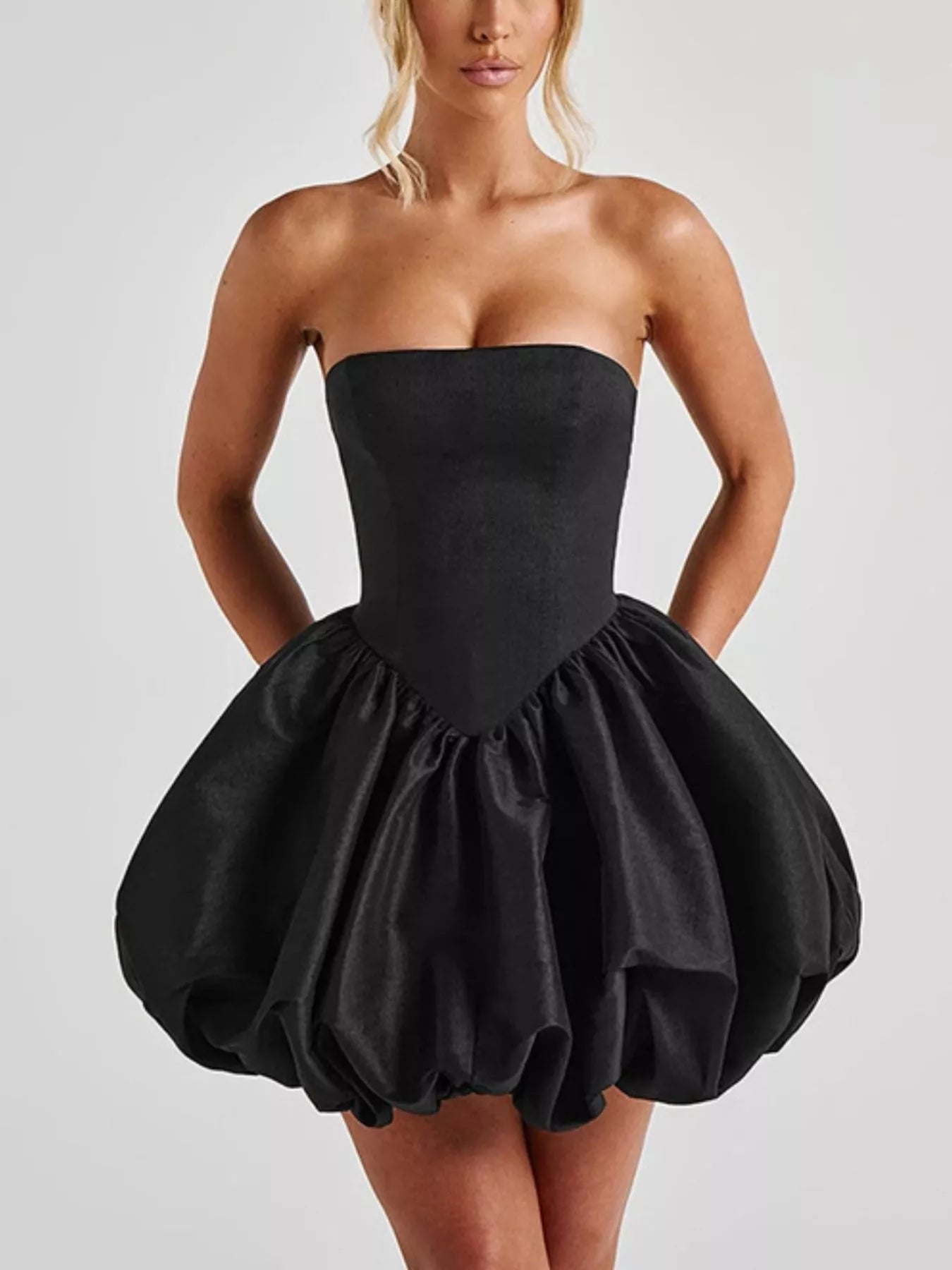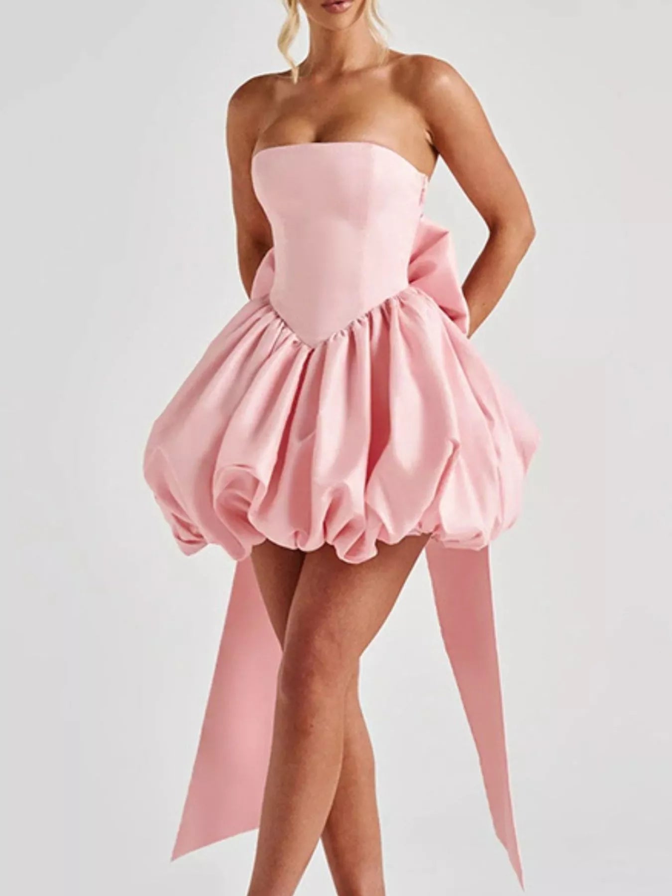 Make a refined statement with this strapless mini dress, defined by its signature bowknot detail and distinctive bubble hem. The structured, non-stretch fabric creates a polished silhouette with architectural presence, while the unlined construction offers a lightweight feel. Ideal for special occasions or upscale events where understated elegance meets contemporary design.