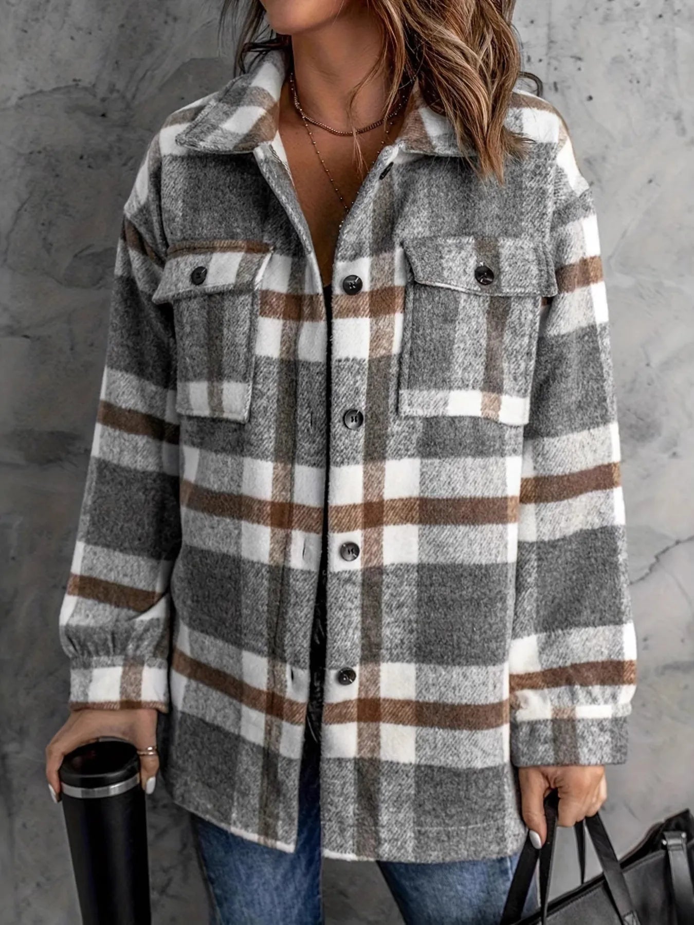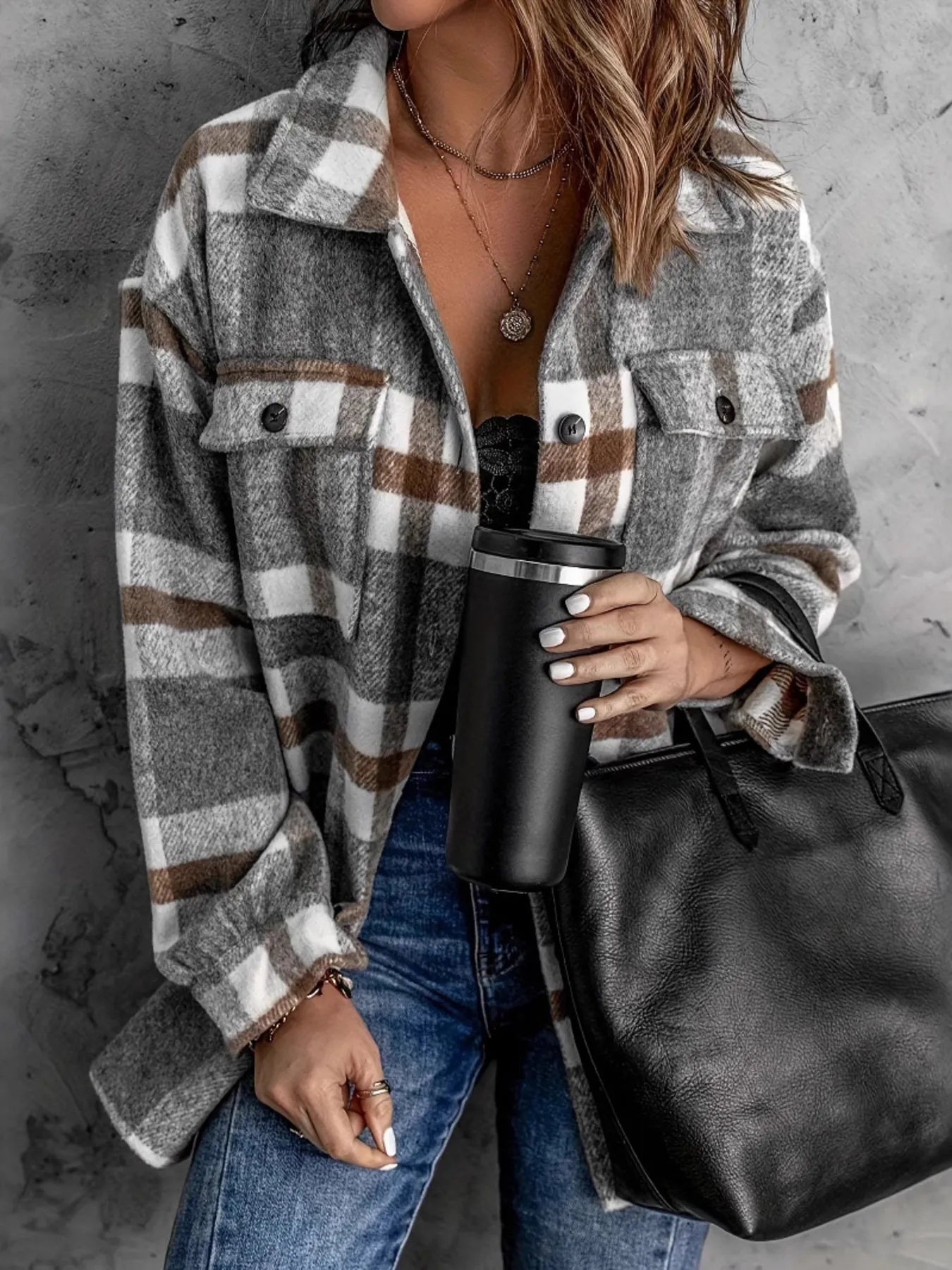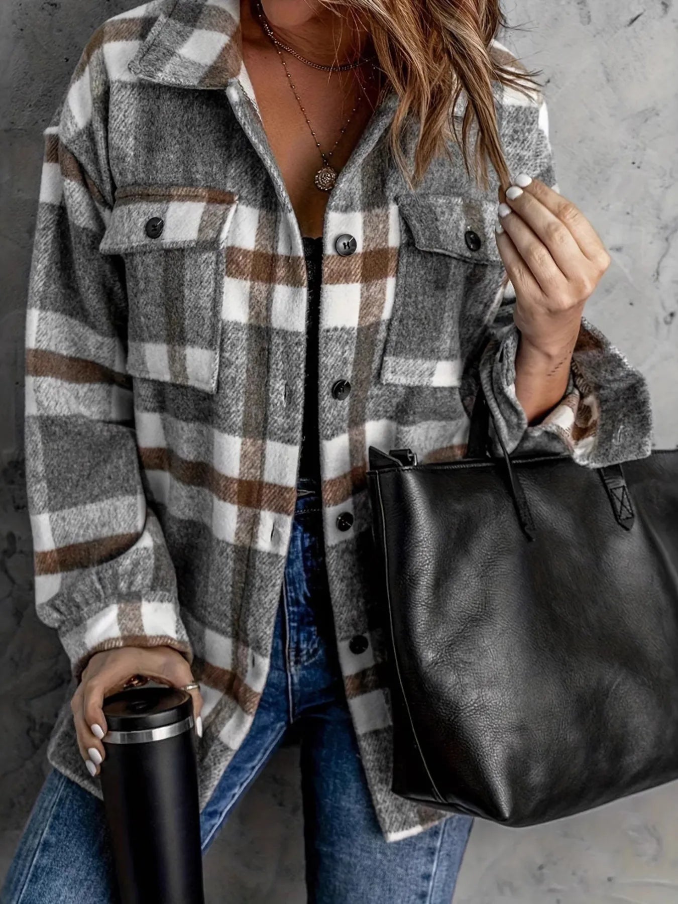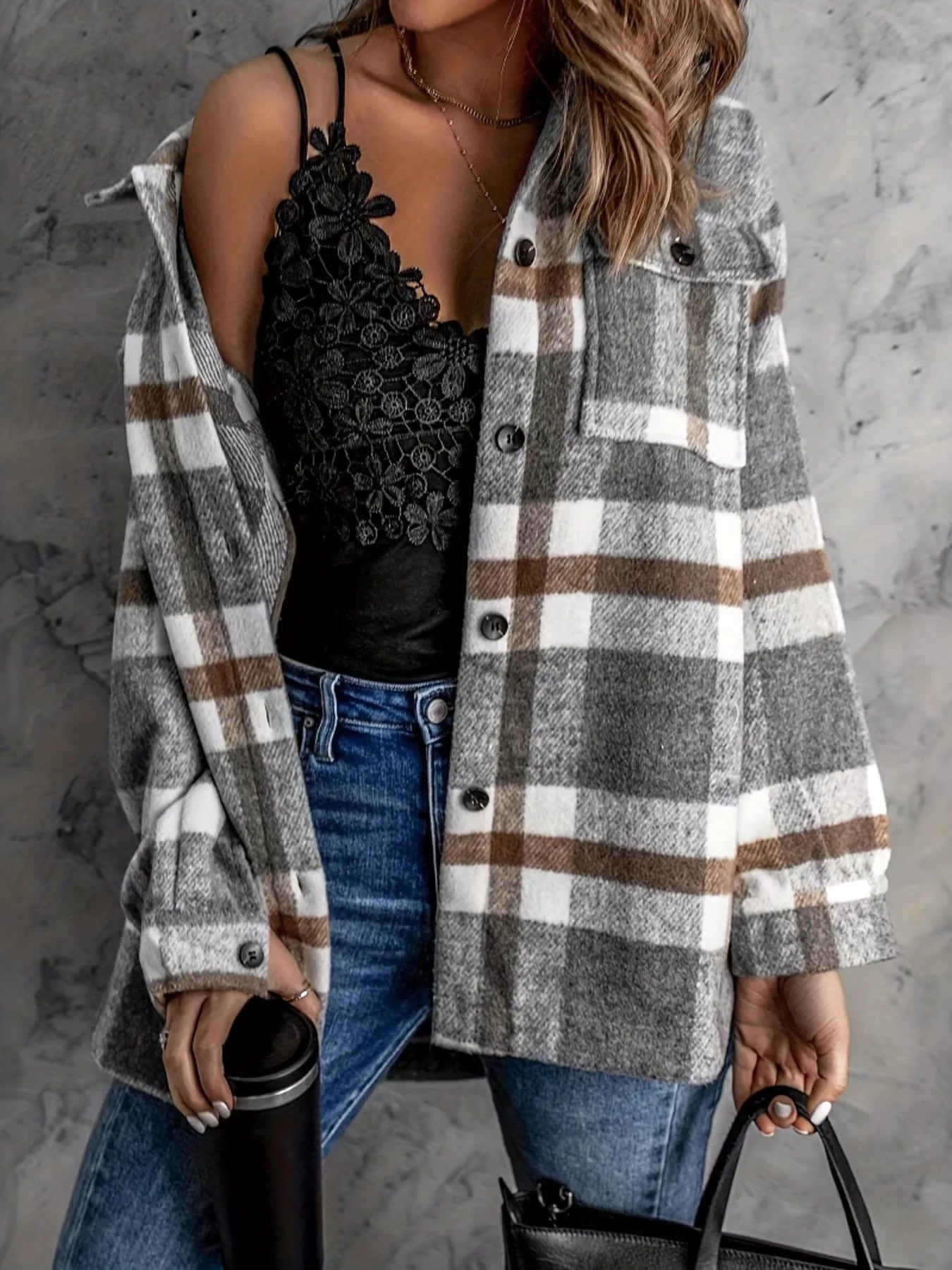 The Oversized Plaid Flannel Shirt Jacket features a button-front design and practical pockets. With a standard thickness, this shacket offers a comfortable and versatile layering option.